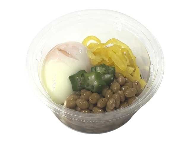 だし醤油を和えた納豆に、半熟玉子、豆腐、たくあん、オクラを盛り付けた、おかずにもおつまみにもなるカップデリです。 カロリー:171kcal 【販売地域】茨城県、栃木県、群馬県、埼玉県、新潟県、長野県