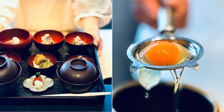 10時、カウンターに着席すると和朝食の時間は厳かにスタートした。いくつものお菜が並んだ膳に驚いたけれど(写真左)、再び友人のアドバイス「最初の膳で終わりじゃないから! ごはんの量を間違えたら大変なことになるから!」を思い出し、目の前でほかほかと湯気を上げるごはんをマックス少量でとお願いする。そこから続いためくるめく時間は、思い出してもちょっとめまいがするほどだ。目の前でふわふわのだし巻き卵が丁寧に焼かれ、ジュージューと音を上げる香ばしい鰻まで登場。何度も言うけど朝ですよ。卵ご飯の好みを聞かれて「黄身だけ」と答えれば、見たこともない道具で白身と黄身に分けてくださった(写真右)。食後、お腹をさすって「ふー」と言っていたら、ご主人が何やら鍋を火に当ててカタカタやっている。何かと思ったら出来立てのわらび餅が出てきた。再び言いますが、朝ごはんです。日本料理店で夕食をいただくのと変わらない細やかさ、充実ぶりだった。