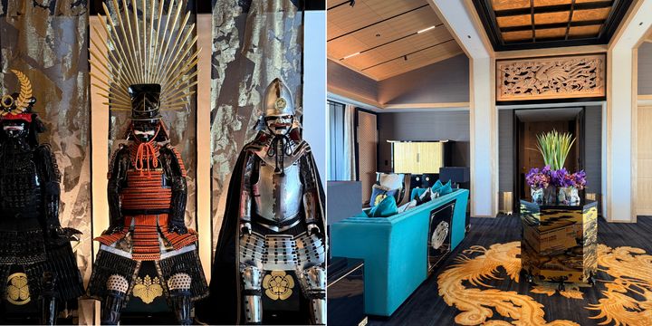 「世界に誇るアートミュージアムホテルへ」が「エスパシオ ナゴヤキャッスル」のキャッチコピーなのだけれど、本当に館内から部屋の隅々まで、いたるところで私は驚き感動しっぱなしだった。エントランスを入るとそこでは信長、秀吉、家康の甲冑(かっちゅう)が出迎えてくれ(写真左)、スタッフの方々のユニフォームは渋く輝くゴールドカラー。スイートルームなどはこのままここで挙式できそうな絢爛豪華っぷりだし(写真右)、地階には本物の温泉を引いたスパがあるし、客室の一部ではテラスにジェットバスがしつらえてあって浸かりながら名古屋城を見ることもできる(水着着用厳守ということでした)。