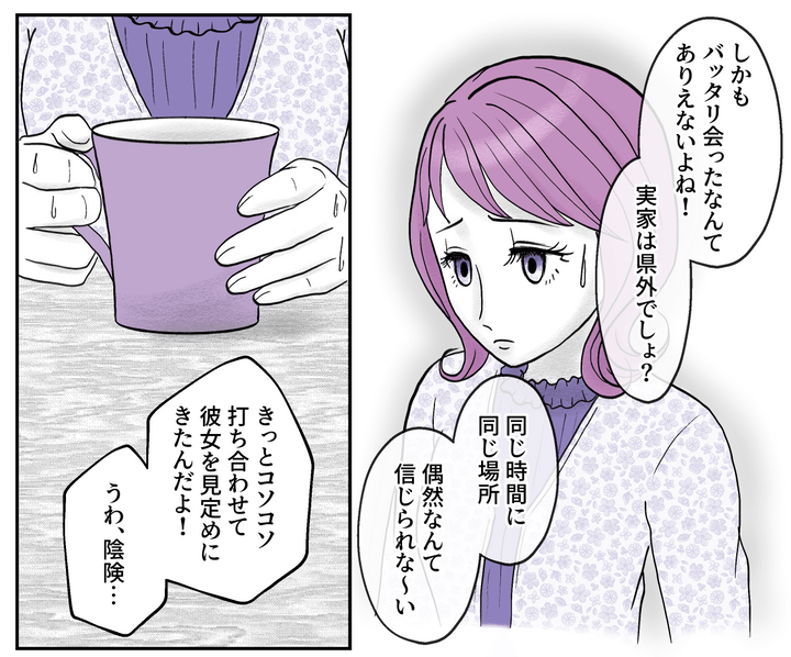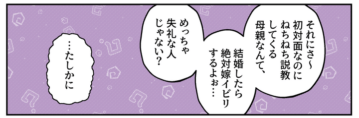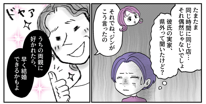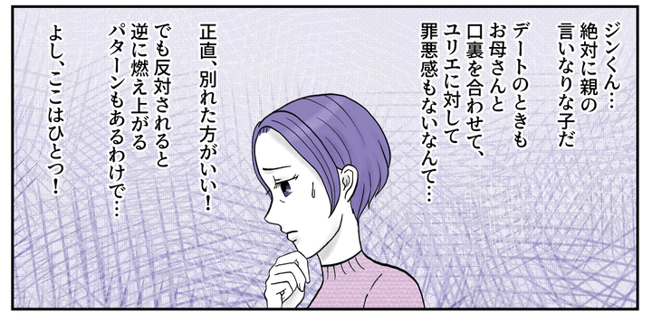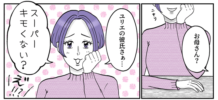 私はアキナ。娘のユリエ(23歳)には、3ヶ月ほど前に合コンで知り合ったジンくん(27歳)という彼氏がいます。付き合いはじめのウキウキした感じを、私としても微笑ましく見守っていました。そんなある日、ユリエは「ジンくんの選んだお店で、偶然ジンくんのお母さんと会った」そうです。お母さんは初対面の息子の彼女に、上から目線の説教をしてきたそうで……。絶対に偶然なんかじゃないでしょう。親としては、この付き合いに対して不安しかありません。