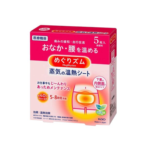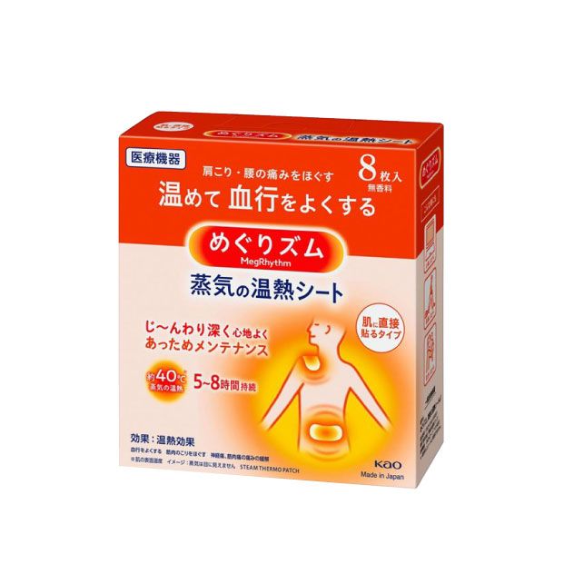 「めぐりズム 蒸気の温熱シート」は、約40℃の快適な温度が5〜8時間続く一般医療機器。蒸気の温熱がじんわりと広がり、体を奥まで温めながら血行を促進します。