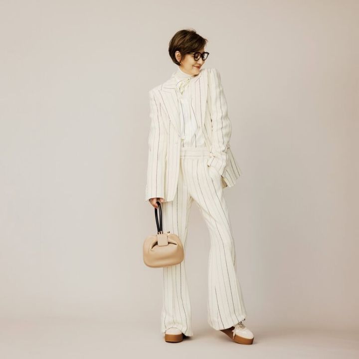 ジャケット×パンツのスーツにブラウスもマルチピンストライプで揃えた、柄on柄のトレンド感あるスタイルです。広めシェイプの衿やフレアな裾などスタイリッシュな要素に、足元は厚底のスニーカーを合わせて、攻め過ぎないようリラクシー感をプラスしています。