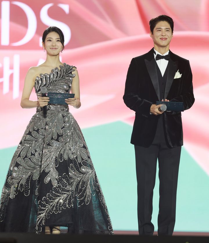 2025年5月5日、ソウルで開催された第61回百想芸術大賞にて。スジは、パク・ボゴム(写真右)やシン・ドンヨプと共に司会を担当して10回目という記念の年になりました。