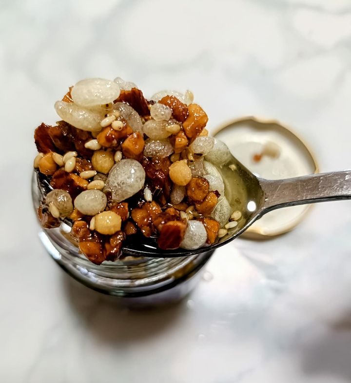 すくい上げると、これでもかというくらいぎっしりとスプーンに具材がのりました。液体よりも具材の割合の方が、圧倒的に多いです。写真でもわかるくらい大ぶりの、アーモンドや白ごま、ぶぶあられ、天かす、フライドオニオンなどがゴロゴロ。いったいどんな味なのか、見た目からは想像がつきません。