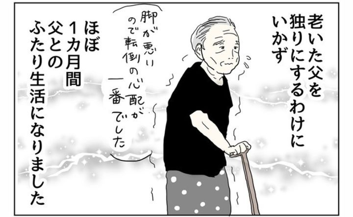 父は、何とか自分の身の回りのことはできますが、家の中でも杖なしでは歩行困難でトイレまで行くのがやっとなので、ほぼ1カ月2人で生活にすることに。一緒に暮らしてみると本当に小食で、「食費がかからないなぁ~」と思うほど。