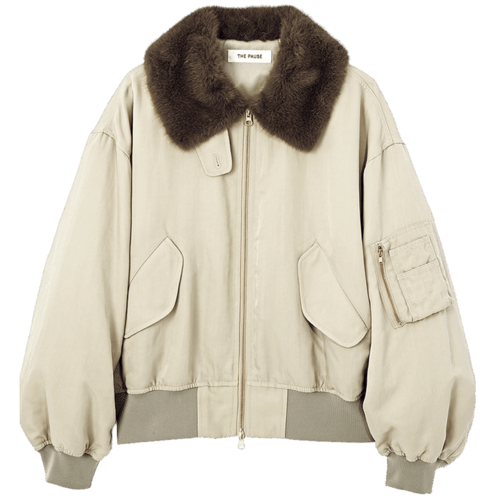「フェイクファーの襟は、タブを留めればスタンドカラーに。防寒対策にも役立ちます。程よくツヤのあるナイロンツイル素材と、淡いニュアンスカラーで、キレイめなスタイルにも」Whim Gazette PR・畑中由香さん