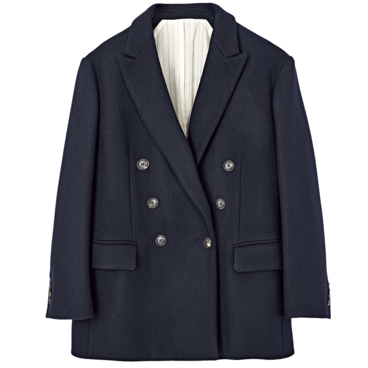 「ダブルブレストのオーセンティックな佇まいに惚れ惚れ♡ ウールメルトンを採用したこちらは、程よい膨らみとハリ感を持ちながらも滑らかな肌触り。着心地も抜群なんです」BACCA PR・金竹麻姫さん