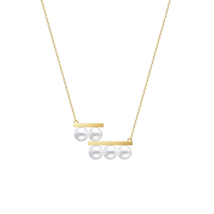 そこから進化した“バランス ステップ”ネックレスは、イエローゴールドのバーを段差状に重ね、合計5玉のパールをアシンメトリーに連ねたモダンな一本。左右のずれが生み出す絶妙な均衡が、デコルテにリズムを添えてくれる。