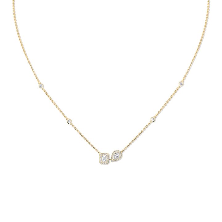 異なるカットのダイヤモンドが隣で寄り添う、小ぶりながら存在感のあるネックレス。チェーンの途中にちりばめられたダイヤモンドがきらめき、1本で取り入れても、他のジュエリーと重ねても美しく映える。