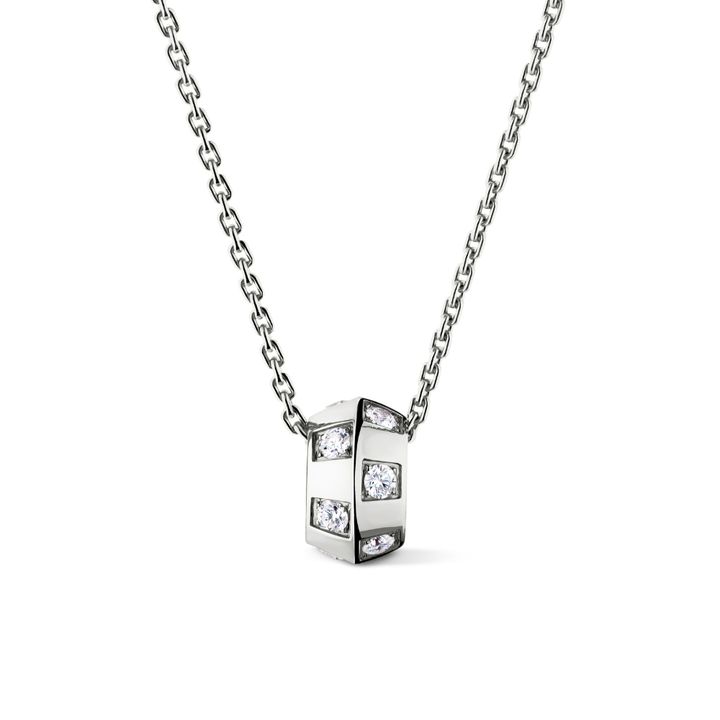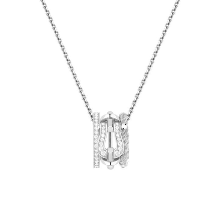 “フォース10”のシグネチャーモチーフをきれいに落とし込んだ、控えめながら個性の光るネックレス。バックル部分にあしらわれたダイヤモンドが、ホワイトゴールドのすっきりとしたラインにさりげない輝きをプラス。装いを選ばないクリーンな表情で、ユニセックスにも使える。