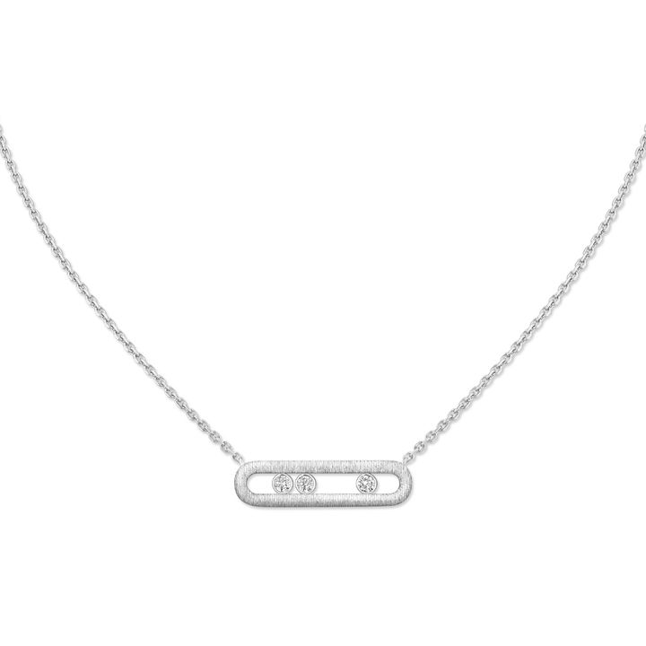 ホワイトゴールドに繊細なレリーフを施し、控えめな光沢をまとわせた“ムーヴ” クラシック シズレ。フレームの中では3つのダイヤモンドが滑らかにスライドし、マットな質感とのコントラストが際立つ。