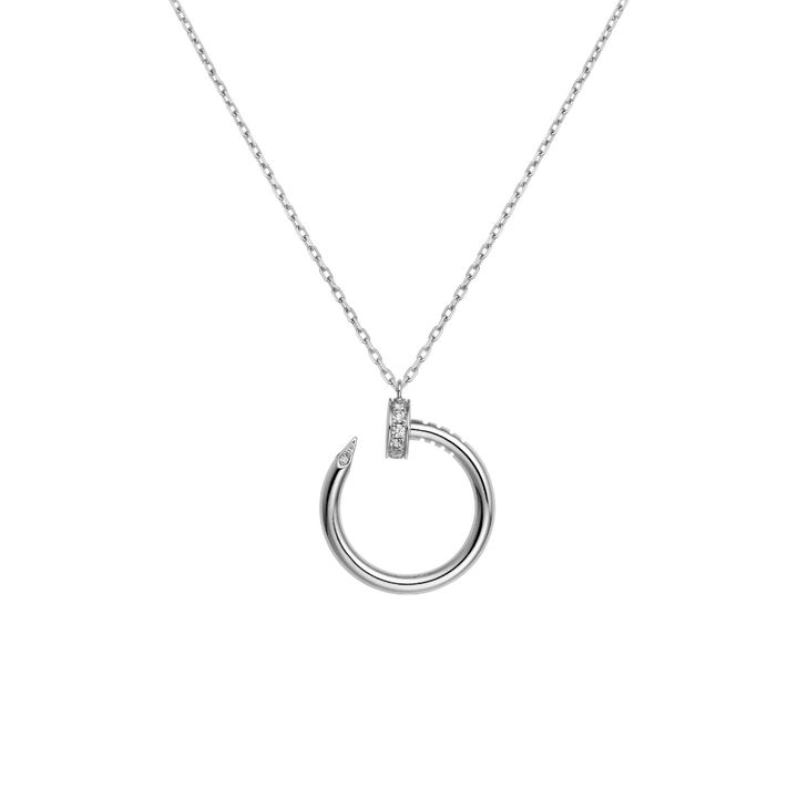 ホワイトゴールドで描かれたネックレスは、くぎのカーブに沿って配されたダイヤモンドが繊細に光を放ち、シャープさとセンシュアルなつややかさが共存する一本。ラインが肌の上をなぞるように流れるそのフォルムは、素肌にも冬のニットにも自然と溶け込み、ユニセックスに楽しめるコンテンポラリーな存在感を添える。