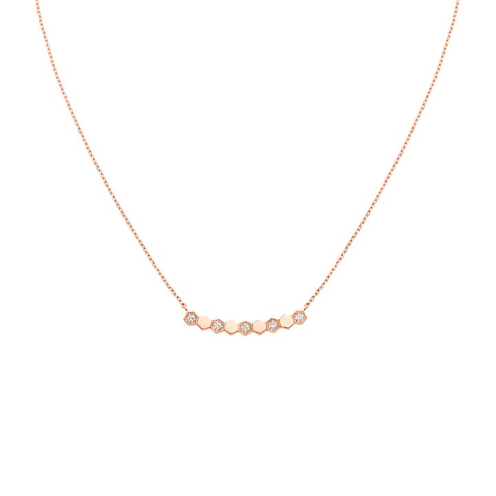 六角形のハニカムモチーフを連ねたネックレスは、ローズゴールドの柔らかな光沢の中にダイヤモンドがリズミカルにまたたくデザイン。ミニマルなフォルムながら表情豊かで、デコルテにそっと動きをつくる一品。
