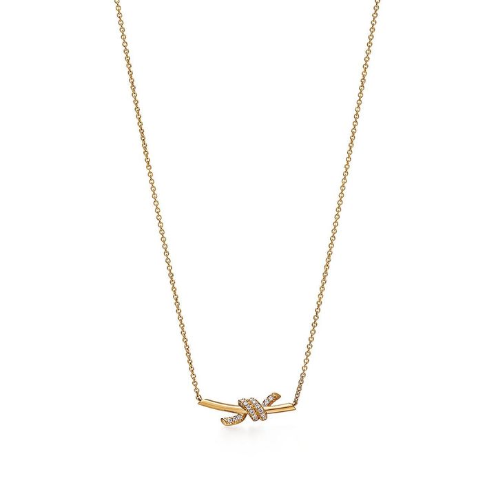 細身のバーに結び目をあしらったペンダントは、滑らかな曲線とシャープなエッジがほどよいコントラストを生む。パヴェダイヤモンドのきらめきが、“ティファニー ノット”らしい都会的なムードを漂わせる。