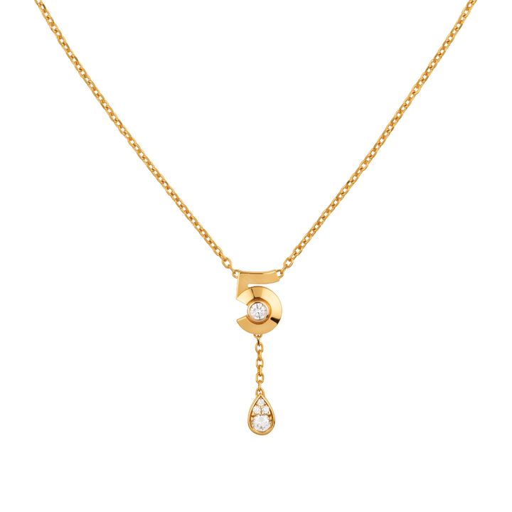 数字の“5”を立体的にかたどったモチーフの下へ、しずくのようにダイヤモンドが一粒揺れるY字型ネックレス。滴る香水の一瞬を捉えたかのようなドロップシェイプが、デコルテにかれんなニュアンスを添える。チェーンは3段階で長さ調整可能。