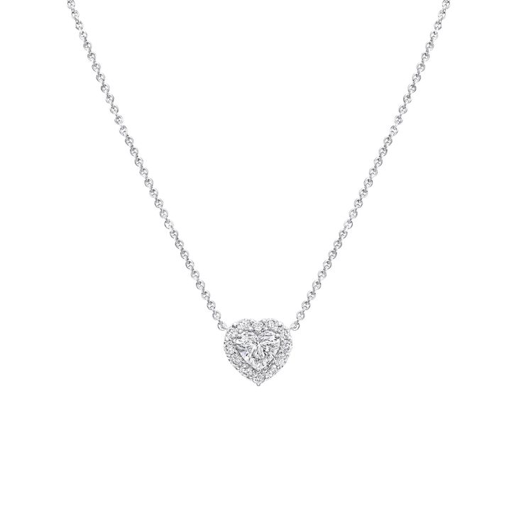 ハートシェイプのペンダントのなかでダンシングダイヤモンドが揺れる、とびきり愛らしいたたずまい。甘さのあるフォルムに、ホワイトゴールドのクールなニュアンスがほどよい緊張感を添え、身につけるたびに心を前向きにしてくれるようなポジティブな魅力が漂う。