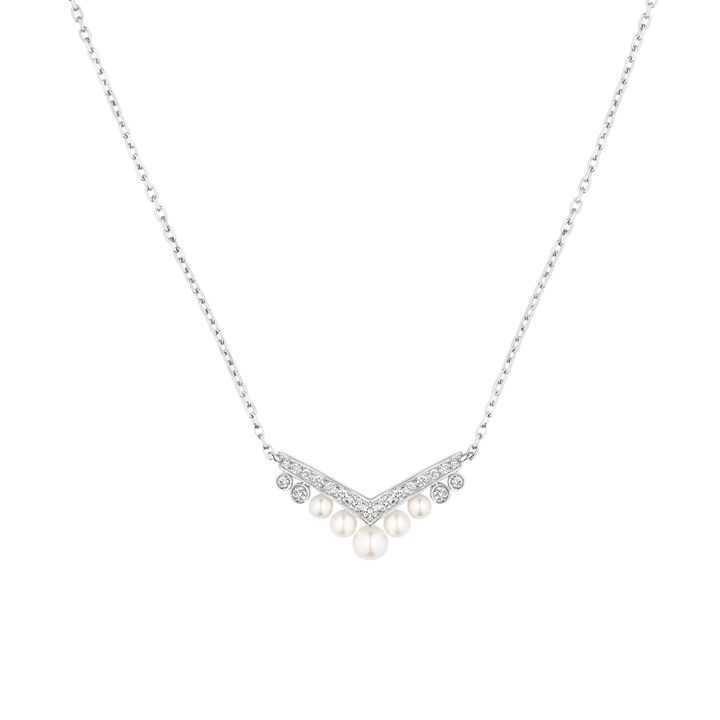 V字を描くアイコニックなシルエットは、ジョゼフィーヌが愛した髪飾り“エグレット”に由来するもの。繊細に敷き詰めたパヴェダイヤモンドに、小粒のパールが首元を優美に飾る。ホワイトゴールドの透明感ある光がわずかにシャープさを加え、タイムレスでありながら今の装いにもすっと調和する名品。