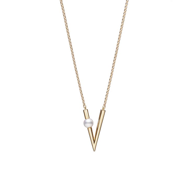 深く描かれたVフォルムの片側にアコヤ真珠を配した、彫刻的なバランスが際立つペンダントは、パールの柔らかな輝きが、Vラインのシャープさをより引き立て、シンプルな装いにも凛としたムードを添えてくれる。