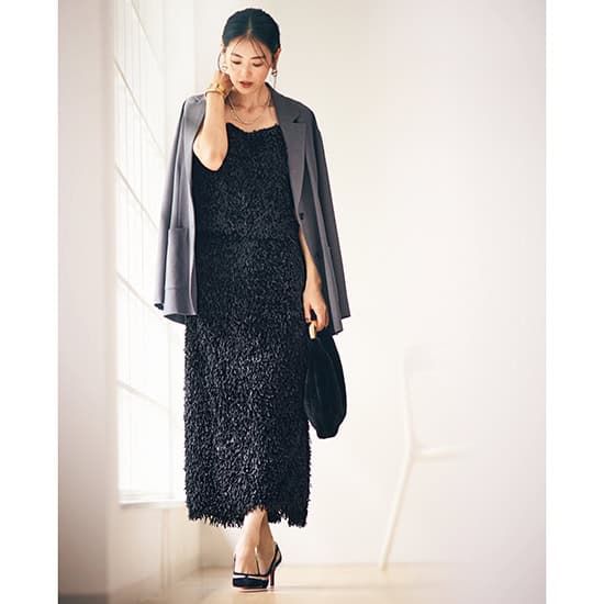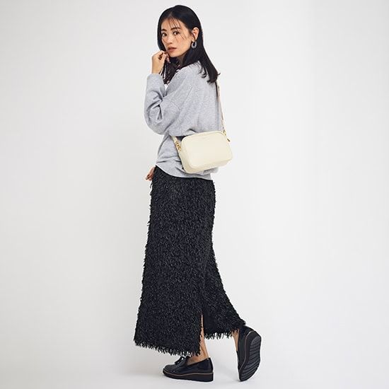 シャギー素材のタイトスカートは、ニットやブラウスはもちろん、スウェットなど案外スポーティなトップスとも好相性。気になるお肉を拾わずシュッと見えが叶う絶妙A ラインです。