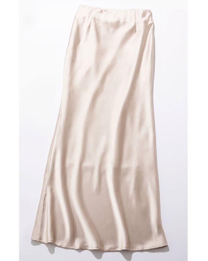 サテンならではの光沢感が上品で、きれいめな印象に仕上がるスカートはロング丈ながらもすっきりとしたシルエットなので縦長効果も。安心して着用できる裏地付きなのも嬉しいポイント。シャツやニットをざっくりと合わせても相性抜群◎。シンプルなのでどんなアイテムともバランス良く着用いただけます。計算された美シルエットでヒップのラインも拾いにくいのが嬉しい。