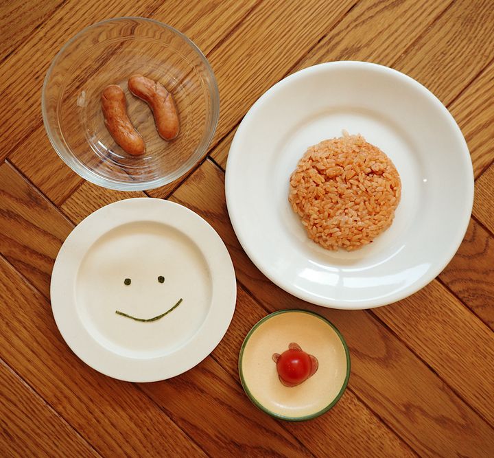 1.ケチャップライスをお椀にぎゅっと詰めてお皿に返して出す2.ウィンナーを縦半分に切り、切り込みを数箇所入れ、電子レンジで30秒ほど温める3.ミニトマトを半分に切る4.ウィンナーの角とミニトマトの鼻、海苔で目と口を作って飾る5.完成