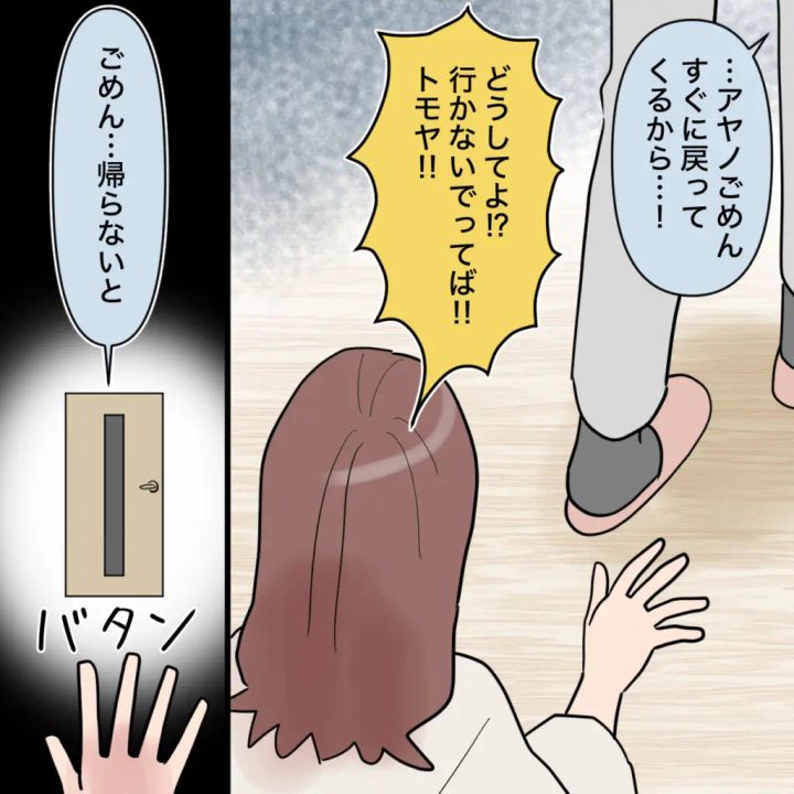 「・・アヤノごめん。すぐに戻ってくるから・・!」そう言って出て行こうとするトモヤの背中に「どうしてよ!?行かないでってば!!トモヤ!!」と叫びましたが、トモヤは立ち止まることなく「ごめん・・帰らないと」と言って義実家に行ってしまいました。