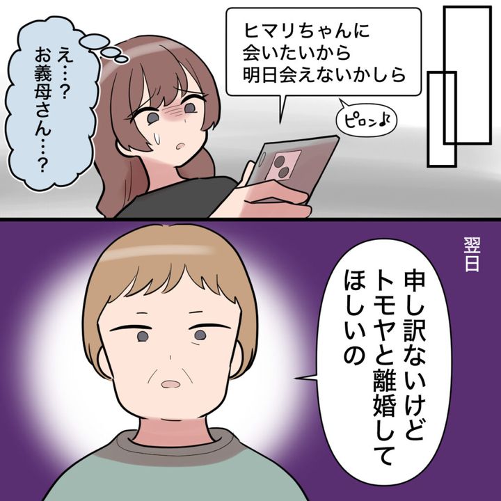 しばらくすると、「ヒマリちゃんに会いたいから明日会えないかしら」と義母からメッセージが届きました。こんな連絡が来るのは初めてです。翌日、戸惑いながら待ち合わせのカフェに行くと、「申し訳ないけど、トモヤと離婚してほしいの」と耳を疑う言葉。