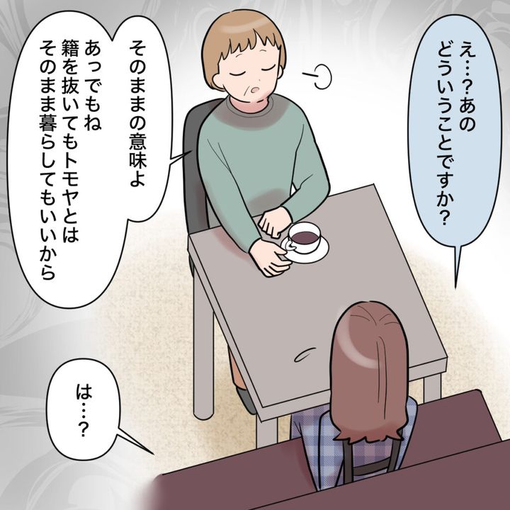 理解が追い付かない私は「え・・?あの、どういうことですか?」と聞き返すと、義母は「そのままの意味よ」と平然と言い、「あっでもね、籍を抜いてもトモヤとはそのまま暮らしてもいいから」と上から目線で言いました。「は・・?」義母の言っていることが全く理解できず、私は頭が真っ白になりました。