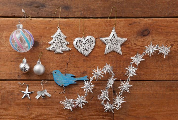白のライン入りガラスボールに、水彩クレヨンでさらに4色を塗り足す。銀色のボールはつや消し、つやありの2種を。星、ハート、クリスマスツリー、ベル、モールなどは銀色で統一。木製の小鳥は水彩クレヨンで青く塗る。