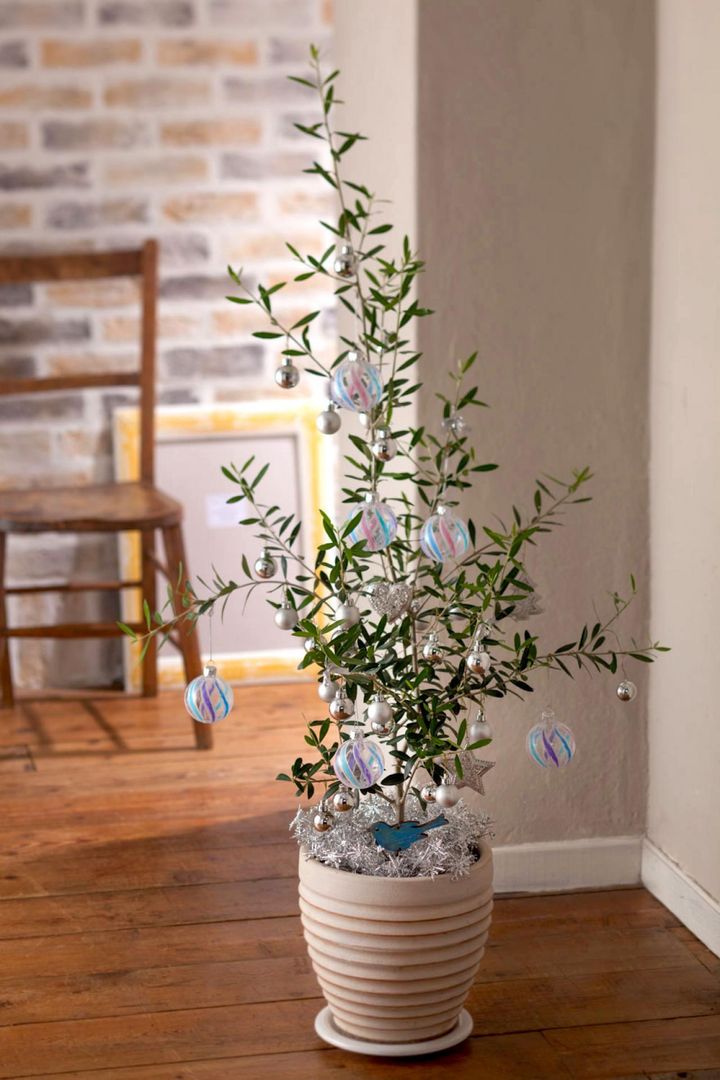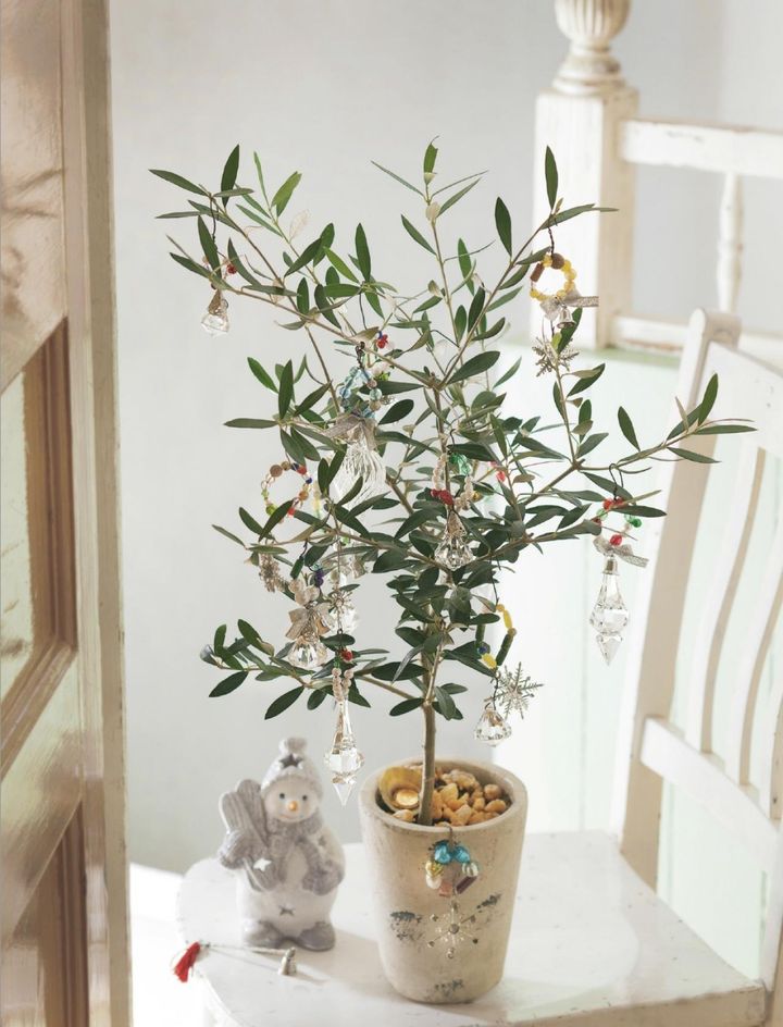 2. ハーブの苗木で簡単【オリーブのクリスマスツリー】キラキラと輝くオーナメントで明るい気持ちに!