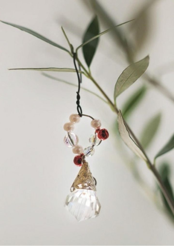 西洋では寒い冬の季節、窓辺にクリスタルの飾りを置いてきらめく光を楽しむ習慣があるとか。光が幸せを運んでくるようです。透明のオーナメントは、プラスチック製でごく軽いもの。赤や青、緑のビーズをプラスして少しだけ色をつけました。