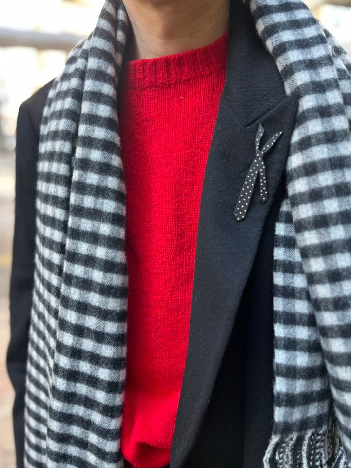 見え方だけじゃないミックス感がフレンチシックの真髄だと語る勝川さん。「世代も国などもミックスしているのにフレンチシックなスタイルに仕上がる。それってすごいことだし、そういうところも私がフレンチシックに魅せられている理由だと思います。今回もイタリア・スコットランド・日本・イギリスといったさまざまな国のブランドをミックスしているのに、最終的にフレンチシックに見えている。それはゆったりとしたサイズ感や黒×赤のカラーリング、ギンガムチェックを取り入れていることなどが影響しているのかもしれません。いずれにせよ防寒とフレンチシックを追求すると、この着こなしになったんです」