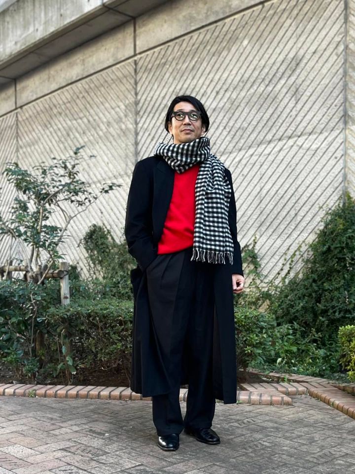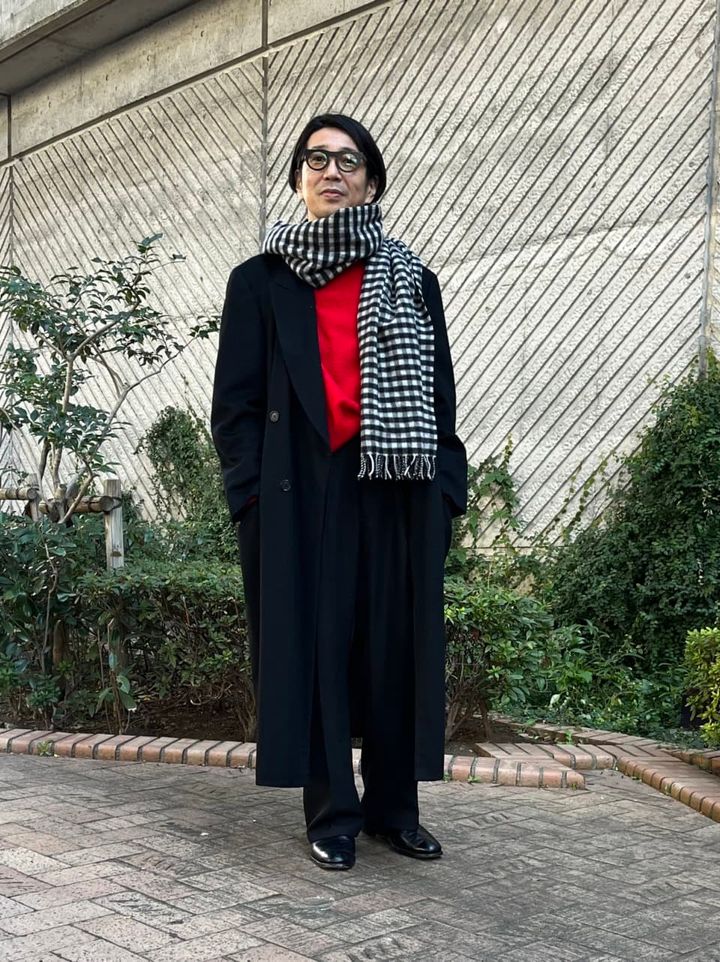 ジョルジオ アルマーニのコート、マルセル ラサンスのニット、ニートのパンツ、ジャック デュランのメガネ、ユナイテッドアローズ グリーンレーベル別注のジョンストンズのストール、グレンソンのシューズは勝川さんの私物