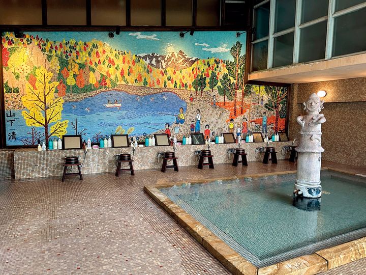 総檜風呂のほか、大浴場の「はにわ風呂」は、埴輪をモチーフにした湯口と、山下清画伯が描いた貼り絵をガラスアートにした壁画に癒やされます。源泉が足元を流れる天然蒸し風呂は、肌も髪もしっとりとうるおい補給。サウナ、温泉、水風呂付きの部屋も、ぜひ。