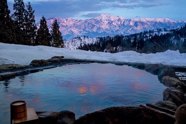 源泉温度27℃を加温した温泉は、美肌の湯として知られます。塩化物・炭酸水素塩泉でとろとろの感触の湯は、肌をすべすべに整えるだけでなく、しっとり感が持続します。森を見渡せる露天風呂は絶景で、とくに夕日に染まる巻機山の美しさは必見です。