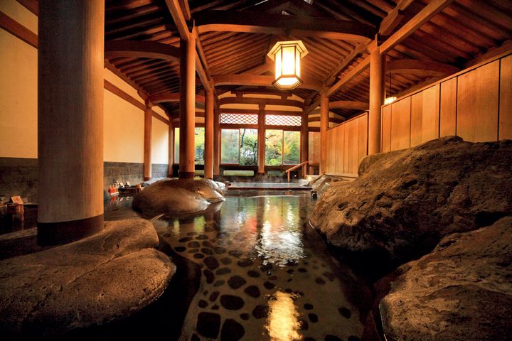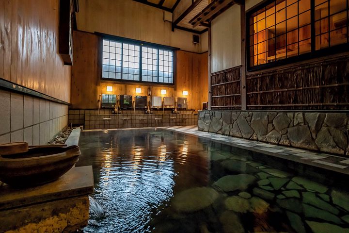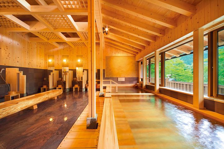 創業1872年、登録文化財の木造建築の宿。源泉掛け流しの温泉で、男女入れ替え制の大浴場や露天風呂、貸し切り風呂などが。名物の「天平大浴堂」は、天平文化をイメージした見事な総檜造りです。立つと胸元近くまである深湯は、湯の力強さを感じつつも、とろりとやわらかく肌に寄り添うよう。
