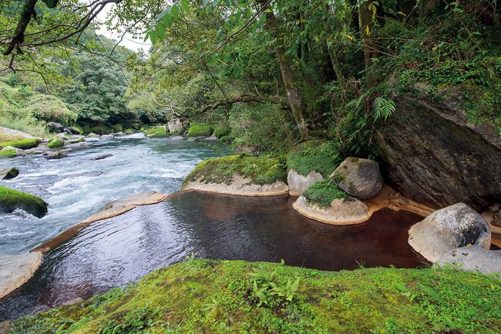 名湯「鍵湯」の湯船は、湧き出る吉井川の川底と、花崗岩の一枚岩でつながる野趣溢れる造り。湧き立ての新鮮な温泉が滔々と流れる湯は、ぎゅっと抱きしめてくれるような密着感があります。館内には飲泉所も。内臓を整え、体の中と外からきれいに。立って入る「立湯」も有名です。