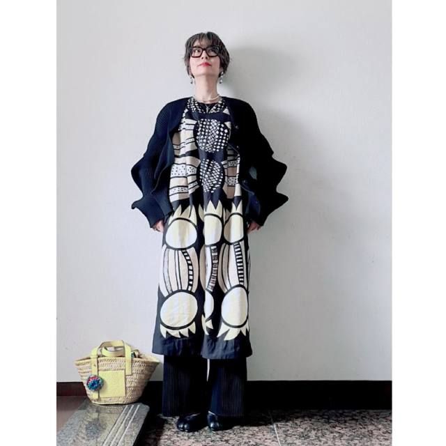 「プリーツワイドパンツ」はワンピースとの重ね着にもお役立ち。生地に落ち感があるからワンピースとのレイヤードが着膨れせず、スマートなルックスに。おしゃれを楽しみながら足元の冷え対策にもなりますよ。