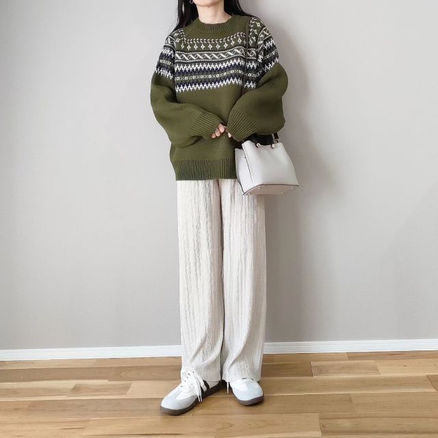 【プリーツパンツの冬コーデ1】ゆったりニット×プリーツワイドパンツ