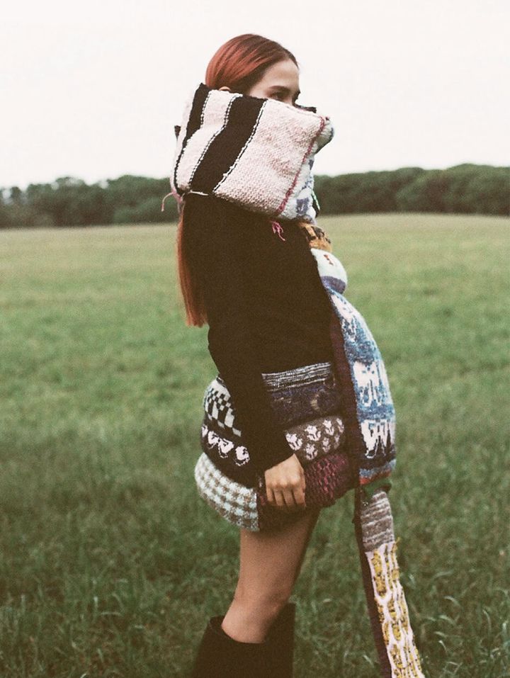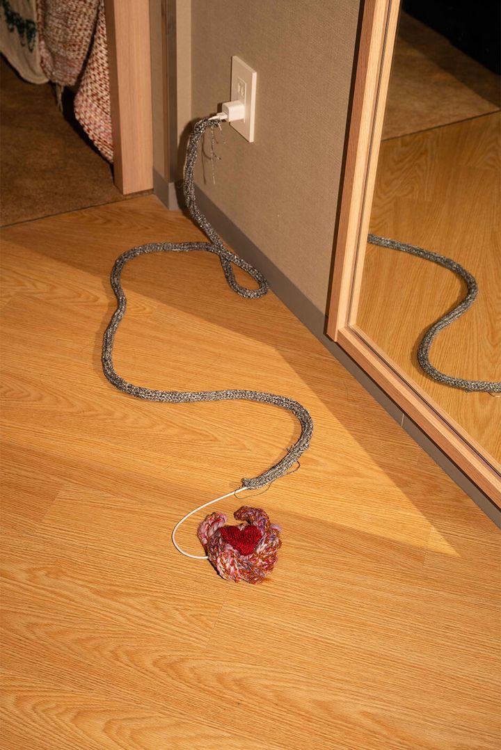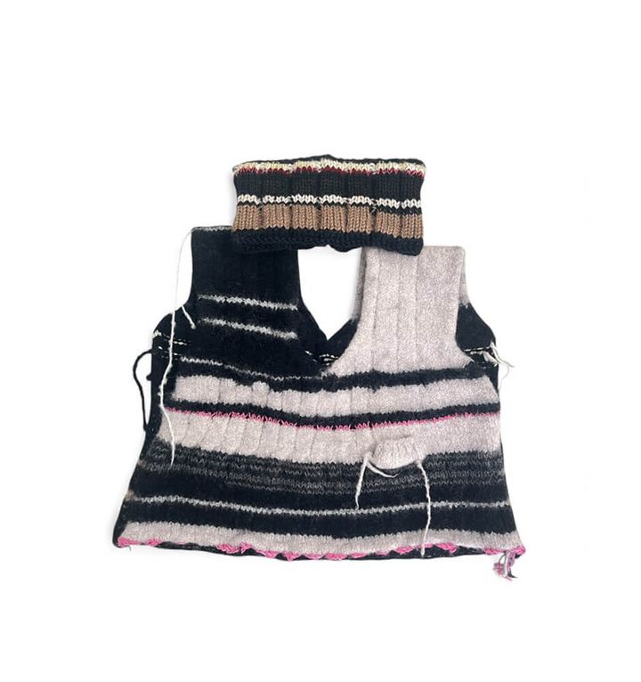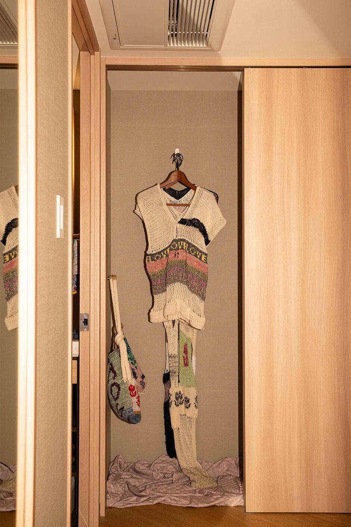 電気を使用しない家庭用編み機によって、すでに存在する余剰糸やリサイクル糸と向き合いながら、すべて1点ものの作品を製作する。