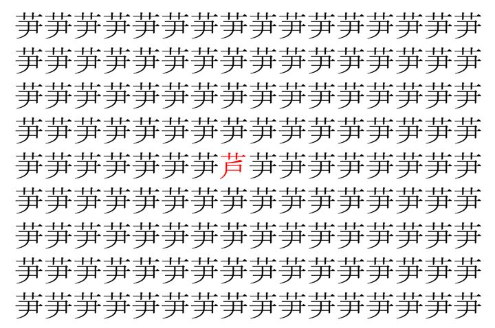 画像の中には、「芛」という漢字が縦に9行、横に16個並んでいます。 全部で144個となりますが・・・、そのうち1つは「異なる漢字」となってますよ!!
