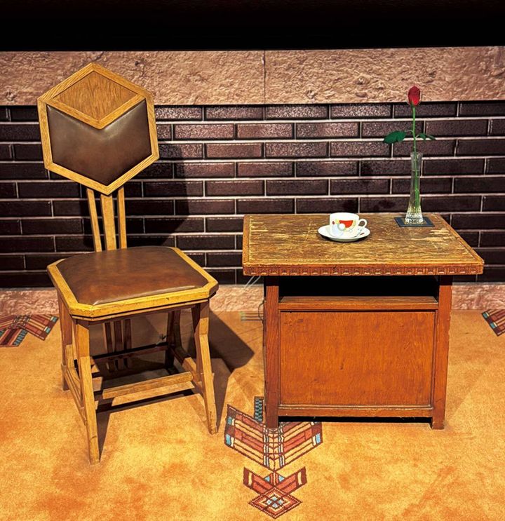 ロビーの階段裏にはフランク・ロイド・ライト設計の旧本館で使用していた机とイスが置かれ、名建築の面影に触れられる