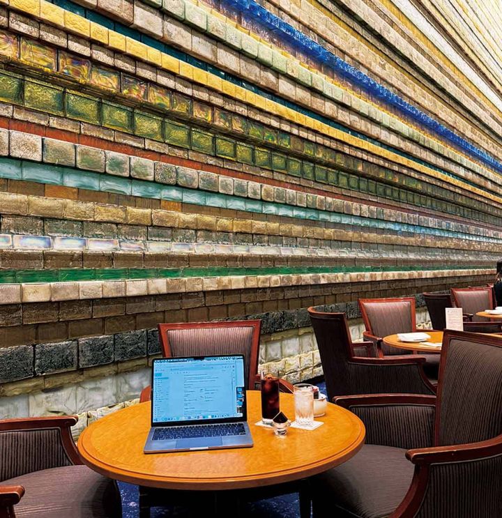 本館1階『ランデブーラウンジ』は多田美波氏の大作「黎明」が圧巻。約7,600個のガラスブロックからなる作品