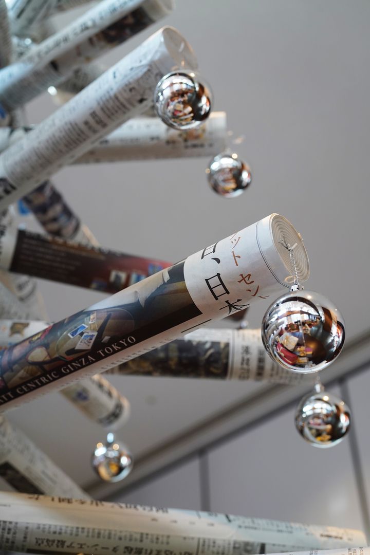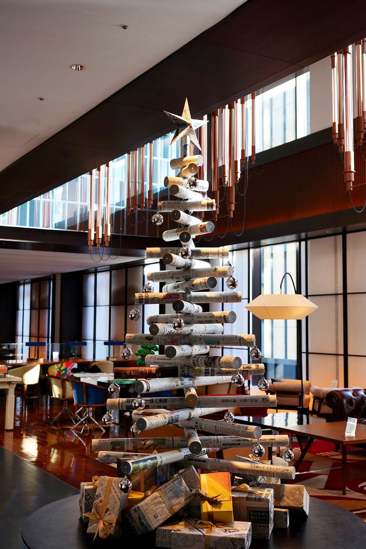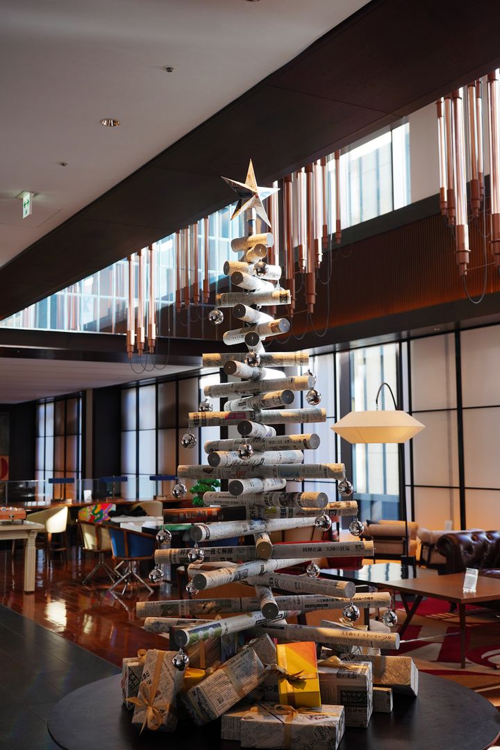 ツリーの枝は、よく見ると本物の新聞紙。ホテル開業以降の新聞紙を使い、棒状に丸め、束ねています。勢いがありながらもどっしりとしたその様子は、街で稼働していた輪転機を想起させるもの。
