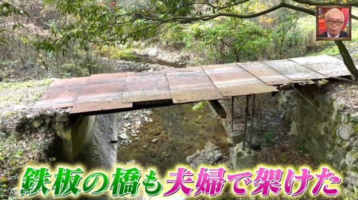驚くのは、夫婦が二人きりで川に橋まで架けたことだ。11年前の大水害で敷地入り口の橋が流されてしまったが、ポツンと一軒家故に行政の援助を得ることができなかった。そこで夫婦で石垣を組んで頑丈な基礎を築き、廃材となった鉄道の線路2本を主桁として渡し、その上に鉄板を敷いて、車も通れる見事な橋を1年近くかけて完成させたのだ。