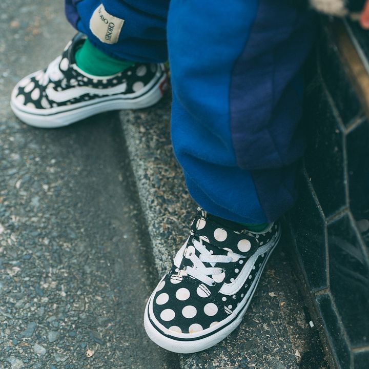 ドットのスニーカーがポップなアクセントに大活躍! 大胆な柄だけれど、ストリートムードをシェアして統一感をアップ♪