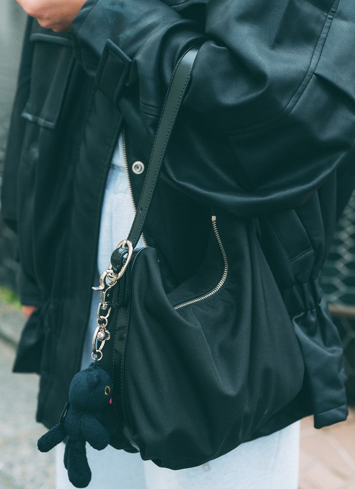 洗練されたデザイン『トゥティエ』のハンドバッグ。黒ネコのバッグチャームを添えて、とことんブラックで統一!