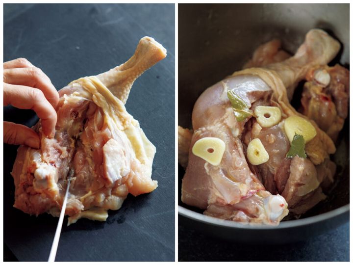 鶏肉は水けを拭き取る。皮目を下にして置き、骨にそって包丁で深く切り目を入れてしっかりと開き、余分な脂肪と筋を取る。ボールに入れ、下味の塩、こしょうを加えて表面全体にすり込む。残りの下味の材料を加えてよくもみ込み、ラップをかけて冷蔵庫で一晩(最短3時間、最長二晩)漬ける。途中、味がよくしみるように一度全体を返す。