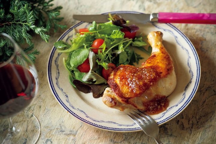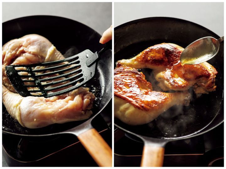 鶏肉は汁けをきり、フライパンに皮目を下にして並べ、強めの中火にかける。パチパチと音がしてきたら、ときどきフライ返しで押さえながらしっかりと焼き色がつくまで5分ほど焼く。裏返して弱火にし、20分ほど焼く。途中3回ほど、鶏肉から出た脂を皮に回しかける。厚みのある部分に竹串を刺し、竹串が熱くなっていて、透き通った肉汁が出れば焼き上がり。たりなければ様子をみながらさらに5分ほど焼く。器に盛り、つけ合わせを添える。