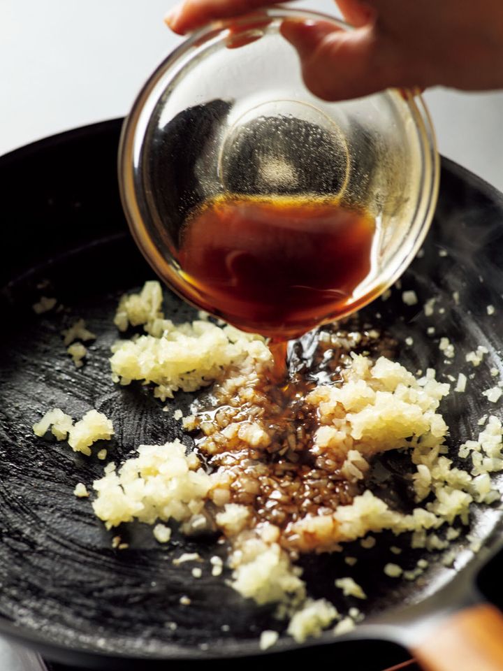 〈照り焼きソース〉 の材料は混ぜる。フライパンの脂を小さじ1程度残し、残りの脂を拭き取る。玉ねぎを加えて中火にかけ、透き通るまで炒める。ソースの材料をもう一度混ぜてから加え、混ぜながら煮立てる。かるくとろみがついたら火を止め、鶏肉にかける。